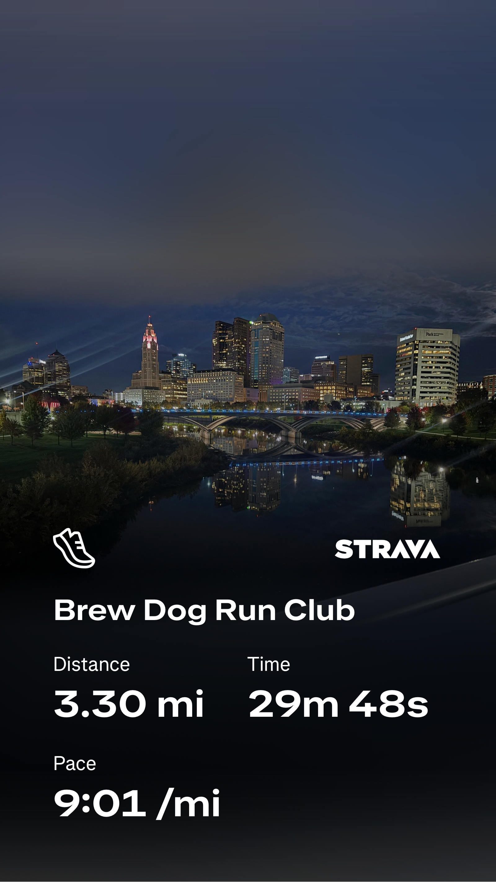 November 4, 2025 Kevin Holtsberry Beautiful fall evening for run club. 🏃needed lights but skyline was pretty.